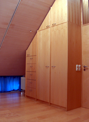 bestehen einheitlich aus heller Birke. Direkt über dem Boden markiert ein umlaufendes Fensterband aus teils transparenten, teils mattierten Gläsern die Anhebung des Dachs, trennt Alt und Neu, und erfüllt den Raum mit gleichmäßigem warmem Licht. |